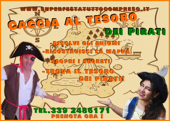 2 animatori in costume da pirata+scenografia a tema, tanti enigmi da risolvere, segreti da scoprire, una mappa da ricostruire per trovare il tesoro dai dobloni d'oro!